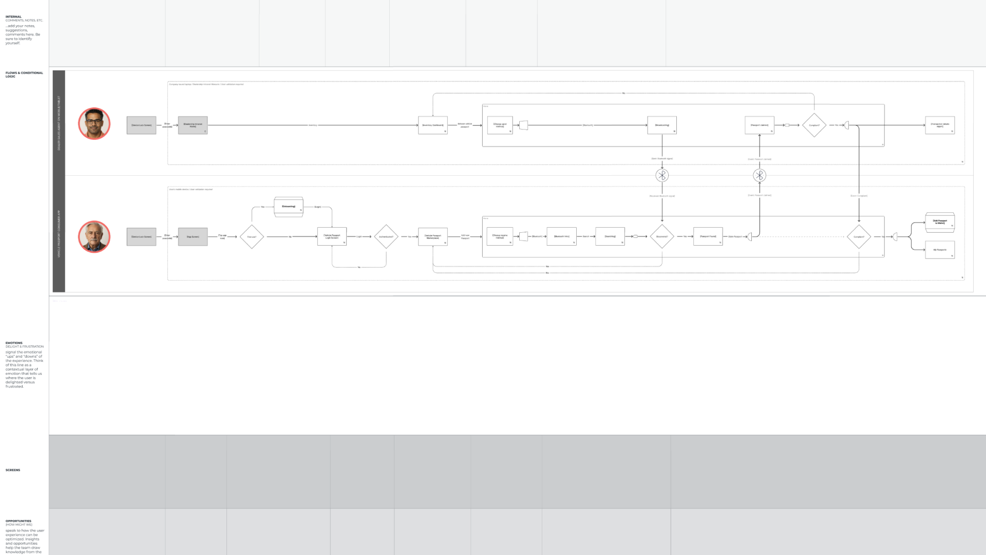 | Fidelity | As an alignment artifact, the level of detail needed should be as minimal as possible. Adding multiple and vibrant color or UI controls within the artifact can lead to unnecessary distractions while trying to align cross-functionally. The idea of the artifact is to arrest and visualize conditional logic (or relational hierarchies) and show user wayfinding and experience flow. Color is not required to accomplish this and only adds more time to build the artifact by introducing visual clutter. |