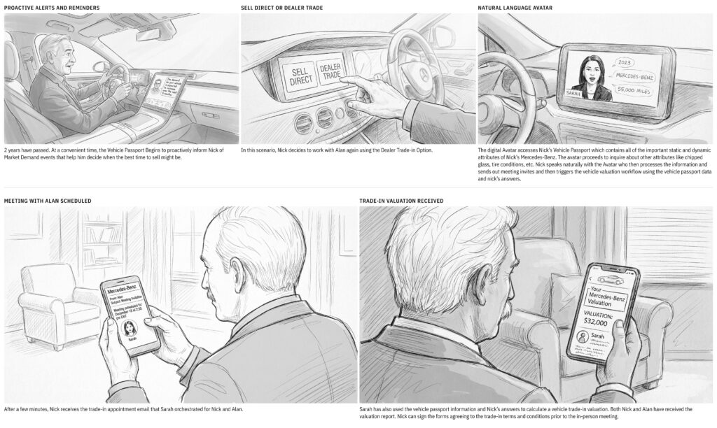In scenario 2, we assume Nick’s Mercedes-Benz passport has kept up with the vehicle’s dynamic and static attributes that have occurred over the last 2 years. The Vehicle Passport app recognizes a growing demand for Nick’s Mercedes and chooses the best time to proactively alert Nick to the opportunity. Nick is ready to drive something new and uses the Vehicle Passport app to start the trade-in process.