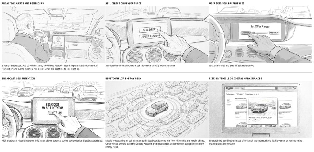 In this scenario, a proposal is made to address user’s wishing to sell direct and how they might list a sell or buy intention on different marketplaces including Amazon as well as the Vehicle Passports’ own buy/sell platform.